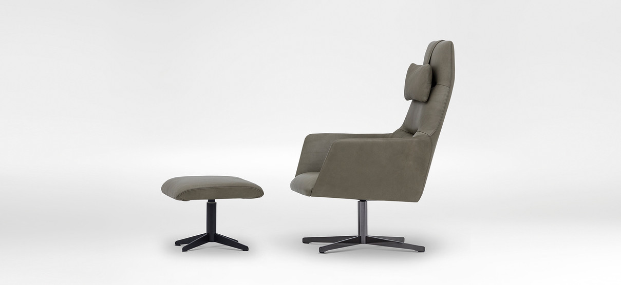 Reminiscent of folded paper origami, the Qing Chair (High Back) is creased at the arms, back and headrest with the utmost comfort in mind. The high back paired with a soft pillow for the head provides neck and shoulder support that is greatly appreciated as you kick up your feet on the optional ottoman. Filled with integrally molded polyurethane foam, the crisp lines of the Qing Chair (High Back) are softened giving supple support to the back and seat only increasing the level of comfort. Available in your choice of fabric, leather or a combination of the two sitting atop either a Grey Oak or black Nickle swivel base. Also available in a low back version or with an optional ottoman.