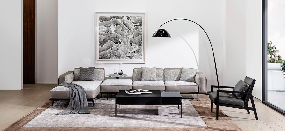Sleek leather upholstered outer metal frame securely holds plushly overstuffed cushions in place. A delicate balance between sturdy construction with utmost comfort is executed in the Moda Sofa Series. Exceptionally comfortable seats rests atop streamlined metal legs. Down-filled cushions and detailed stitching invite you to curl up and unwind. Chic enough for a posh New York City condo, yet cozy enough for a mountain cabin in Vail, this beautiful yet simple design fits seamlessly into any backdrop. Available in lounge chair, sofa and sectional configurations with your choice of all fabric (removable), all leather, or fabric and leather combination upholstery.